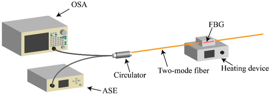 Fiber Bragg grating (FBG), as an important fiber technology, possesses advantageous properties for fiber-based sensors such as high resistance to electromagnetic interference, enhanced sensitivity, compact size and desirable network extensions [1,2]. Various physical quantities such as temperature, stress, curvature and refractive index have been well studied, using FBG-based fiber sensing devices [3,4,5]. A typical FBG is applied on single-mode fibers (SMFs), inscribed with periodic Bragg grating structure, so as called a single-mode FBG. Single-mode FBG is widely used in the fiber sensing field, which has characteristics of low transmission loss and single mode propagation [6]. Not only limited to SMFs, grating structures, in principle, can be written on any fiber with a sensitive core, for instance, a few-mode fiber. A few-mode fiber supports a limited number of transverse modes [7]. It has been demonstrated that pressure, stress and curvature sensing can be realized individually using a few-mode fiber based sensing system [8,9,10,11]. If now we consider combining it with the FBG technology, a few-mode FBG, therefore, it can be expected to be used for multi-parameter measurements and comparatively reduced cross-sensitivity, as observed in single-mode FBG [12,13,14,15].