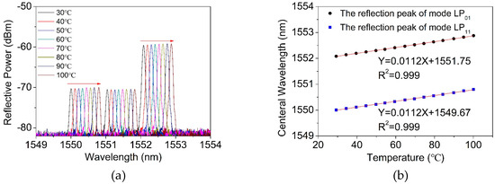 The TM-FBG based fiber sensor was characterized for temperature and curvature sensing. The temperature experimental setup is shown in Figure 6. As seen from the figure, we selectively chose a fiber section with FBG inscription as the temperature unit. Figure 7a exhibits the red-shift of the center wavelength of three reflections in the TM-FBG, when the temperature increased from 30 °C to 100 °C with a step of 10 °C. The central wavelengths of the reflections of the LP01 and LP11 modes under different temperature are plotted in Figure 7b. The results showed that both the LP01 and the LP11 modes had a similar temperature response of 11.2 pm/°C, owing to the same transmission medium (fiber core), which had the same thermo-optical and expansion coefficients of the two modes. Indeed, the temperature response of the two-mode fiber was very close to the value of temperature response in a single-mode FBG (10.7 pm/°C) [21].