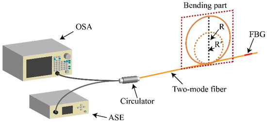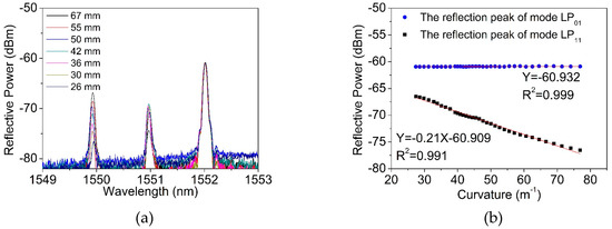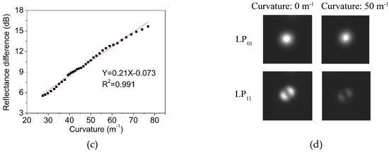 The calculation in Figure 3 indicates that the mode confinement loss of the mode LP01 was much lower than that of the LP11 mode, when the fiber was bent. We then considered using the TM-FBG for bending measurements. An amplified spontaneous emission source (ASE, ASE-CL-20-B, WavePhotonics, Pittsfield, USA), an optical spectrum analyzer (OSA, AQ6370B, Yokogawa, Tokyo, Japan) and a circulator were used for the measurements. The experimental setup is depicted in Figure 8. The optical fiber was wrapped around a loop with an adjustable radius. The smaller the loop radius, the severer the bending applied to the TM fiber. As seen from the figure, we selectively chose a fiber section without FBG inscription as the bending unit, and this section was bent into a circle of different diameters. Figure 9a shows the reflection spectrum when the bending diameter changed from 67 mm to 26 mm. Figure 9b presents the reflected power as a function of the bending curvature, of the two modes. Only when the curvature was larger than 25 m−1, the change of the transmission became obvious. From Figure 9b, when the curvature increased from 25 m−1 to 80 m−1, the intensity of the reflection peak of the LP11 mode decreased at a rate of −0.21 dB/m−1, and the linearity was 0.991. On the contrary, the reflected peak intensity of the LP01 mode was almost kept unchanged at −60.932 dBm. Considering the actual intensity of the light source will fluctuate in the process, the variation of the reflection peak intensity of mode LP01 as the reference, it can modify the reflection peak results of mode LP11, making the measurement of the fiber curvature more accurate. Figure 9c shows the difference change of reflectivity intensity between the two peaks with the increase of curvature. The near-field mode patterns were recorded using an infrared camera (Bobcat-320, Xenics) and plotted in Figure 9d. Clearly, we can observe that the LP11 mode was susceptible to the fiber bending, and therefore, led to a dimmed output.