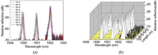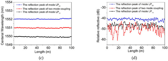 Using the on-line FBG writing system on the drawing tower, a 100-meter-long two-mode FBG array with an equal grating spacing of 1 meter was inscribed. The total of the 100 FBGs were continuously written in a row without any splicing joint. The fabricated array was then demodulated using a grating interrogator (LGI-100B, Sentek Instrument, Blacksburg, VA, USA), using the wavelength scanning time division multiplexing (WSTDM) technique. This technique can accurately measure the central wavelength and reflection spectrum of each grating. Figure 10a,b show the spectra of 10 selected gratings located from 0 m to 100 m, with an interval of 10 m. Figure 10c plots the center wavelengths of each reflection peak in the FBG array, and the fluctuation was limited to less than 0.1 nm. Figure 10d shows the intensity of each reflection peak in the FBG array. The reflection peak intensity of mode LP01 was as high as around −40 dB, with a fluctuation of less than 5 dB: A similar level was found in a single-mode FBG array [22]. The intensity of the reflection peak of the LP11 mode was prone to external influences, and therefore, the fluctuation ramps up to ~8 dB. As seen in Figure 10d, the fluctuation of the coupled mode was unstable, with a value of ~16 dB. It is clear that the measurements with both the LP01 and LP11 modes have good consistency and stability, making the TM-FBG array an effective sensing network for real applications.