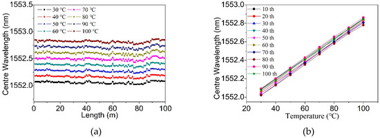 The 100-meter-long TM-FBG array was further tested for quasi-distributed temperature sensing. The FBG array was placed into a chamber with temperature control, and the center wavelength of the LP01 reflection was recorded. Figure 11a shows the variation of central wavelength when all FBGs were heated from 30 °C to 100 °C with a step of 10 °C. It can be seen that there was a slight red-shift. Figure 11b extracts the wavelength variation of the FBGs every 10 m, and we found that the wavelength shift and the change of temperature kept linear, as ~10.9 pm/°C.