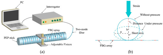 As discussed in Section 4, the reflected peak intensity of the LP11 mode has a linear relationship with the curvature when it is larger than 25 m−1 (corresponding to the bending diameter 80 mm). We then designed an experiment to verify the system for quasi-distributed curvature sensing. The setup is shown in Figure 12a. The FBG array was helically winded over a stick with a diameter of 50 mm. The stick used for curvature sensing was made from polyethylene and propylene (PEP), which is the combination of polyethylene glycol (PEG) and propylene oxide (PO). The adjustable fixture clamped the winded part, applying pressure in this region. The influence of the fixture pressure is depicted in Figure 12b. When the pressure was applied, the sponge substrate was pressed and the curvature of the fiber increased rapidly towards the short axis, leading to a high bending loss. The vertex of the short axis had the maximum radius of curvature, with the bending radius defined as R = a2/b (a is the length of the long axis and b is the length of the short axis). The spatial resolution of this system can be adjusted by changing the winding density of fiber over the sponge substrate, and the sensitive threshold can be controlled by changing the diameter of the substrate material.
