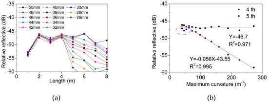 Figure 13a shows the results of different bending degrees at a certain position. This position was chosen between the 4th and 5th FBG (corresponding to the area from 4 m to 5 m of the TM-FBG array). The bending degree of the fiber increased by reducing the length of the short axis. When the bending curvature increased, the intensity of the reflection peaks, located at 1 m, 2 m, 3 m and 4 m, were almost unchanged. However, from 5 m to the rest of the grating array, the measured reflection intensity significantly decreased with the increase of the deformation. It was therefore determined that the position of the deformation was located between 4 m and 5 m of the fiber. Figure 13b presents the reflection intensity of the FBGs at 4 m and 5 m when the deformation increased. It can be seen that the FBG at 4 m was hardly influenced, while the peak intensity of the FBG at 5 m was reduced. When the maximum curvature changed from 50 m−1 to 300 m−1, the reflected peak intensity of the 5th FBG decreased at a rate of −0.056 dB/m−1, and the linearity was 0.991. Note that in the measurements, the first few data points (marked with red circles in Figure 12b) failed to meet the expected trend. It was supposed that when the bending degree was low, errors could be large due to the tension raised during fiber winding.