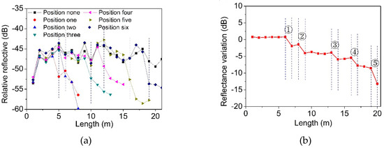 As shown in Figure 14a, six positions were selected randomly and individual deformation was then applied. The measured results show that the first FBGs of the reflection peak intensity decreased were located at 5 m, 6 m, 10 m, 12 m, 16 m and 19 m. In general, this system can reliably identify the positions of the deformation spots. Moreover, to test the multi-position measurements, five positions were simultaneously applied the deformation at 10 mm, and the result is shown in Figure 14b. The deformation regions can be identified at 6 m to 7 m, 8 m to 9 m, 13 m to 14 m, 16 m to 17 m and 19 m to 20 m.