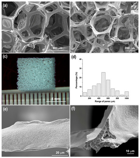 (a) SEM image of the PU foam; (b) SEM image of the HHA scaffold; (c) optical images of the HHA scaffold; (d) Pore size distribution of HHA scaffold, corresponding to the large pores form PU template; (e) SEM images of the porous structure of a strut; (f) cross-section of a strut.
