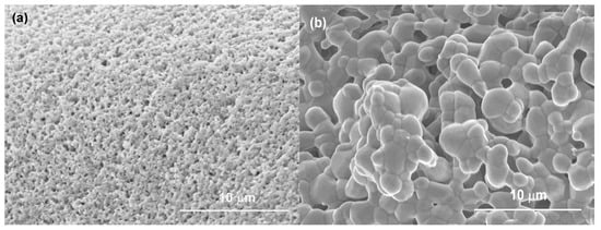 All of the HHA scaffolds fabricated were highly porous, with porosities of approximately 95% as calculated using Equation (1). As shown in Figure 1a,b, the overall porous structure closely resembled the architecture of the PU foam template. The interconnected pores of the HHA scaffolds were primarily in the range of 400–600 µm (Figure 1c,d), and the struts of the scaffolds were about 35–60 µm across (Figure 1e). The surface morphology and the hollow nature of a HHA strut are shown in Figure 1e,f. It was estimated that the thickness of the strut wall was about 2–10 µm. The void in the center of the struts results from removal of the PU template and has been observed in other sintered ceramic foams obtained by using the replication method [6].