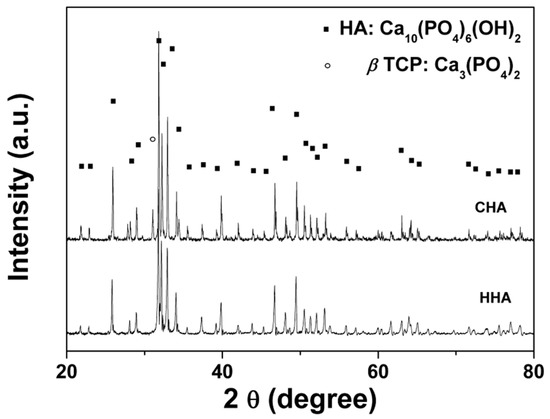 The XRD investigation revealed that crystallization had occurred for both scaffolds after calcination (Figure 4). Both the angular location and intensity of the peaks match the standard card (PDF 04-008-8714), which indicates that the major crystalline phase is HA. The XRD patterns further showed that there were no crystals of calcium hydroxide (Ca(OH)2), calcium oxide (CaO), tricalcium phosphate (Ca3(PO4)2), or octacalcium phosphate (Ca8H2(PO4)6·5H2O). Some impurities or amorphous phase may be present in the HHA, but at levels below the detection limit of the instrument used to collect the XRD patterns. For the CHA scaffold, there was a small amount of beta tricalcium phosphate (β-TCP) detected. At temperatures higher than 900 °C, partial decomposition of HA may take place resulting in β-TCP, which is commonly observed in sintered HA materials [29,30].