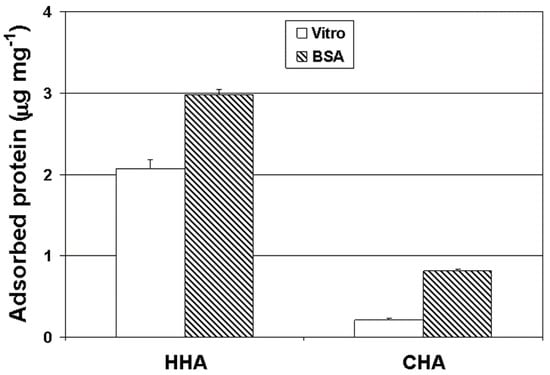 BSA and vitronectin (Vitro) adsorption on HHA and CHA scaffolds after incubation in 0.2 mg mL−1 of the respective protein at room temperature for 4 h.