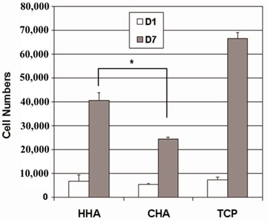 Proliferation of Saos-2 osteoblast-like cells on HHA and CHA scaffolds, and tissue culture plate (TCP) after 1 and 7 days (D1 and D7, respectively). * Significant difference, p < 0.01.