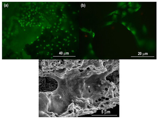 Fluorescence images from the Live/Dead® assay (viable cells stain green; dead cells stain red) on (a) the edge and (b) in the center of the porous HHA scaffold disc. (c) SEM image of Saos-2 osteoblast-like cells on the HHA scaffold after culturing for 7 days. * Cells apparent on the wall of the HHA scaffold.