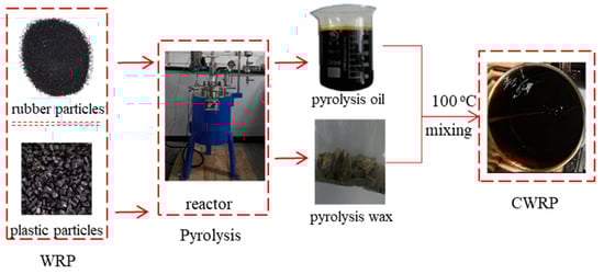 Figure 2 illustrates the production program of CWRP. As can be seen, pyrolysis oil (PO) and pyrolysis wax (PW) were prepared by pyrolyzing waste rubber and waste plastic, respectively. The PO and PW were then mixed with a weight ratio of 6:1 at 100 °C. 100 °C was set as the mixing temperature of PW and PO as the melting point of PW is around 90 °C.