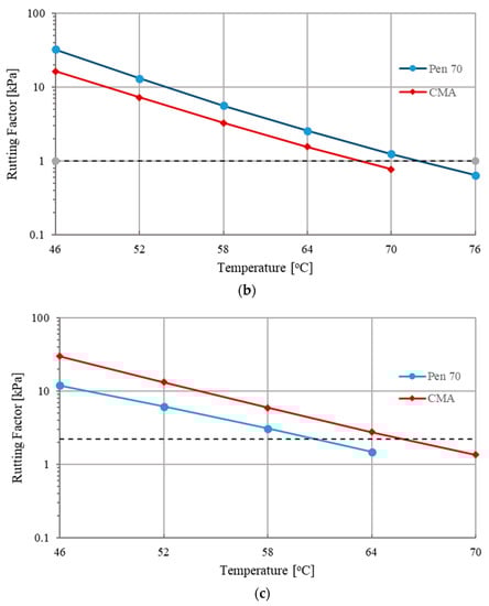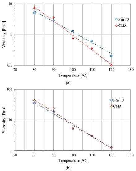 Similarly, the turning point of CMA’s viscosity curve can be observed in the RTFO aged specimens. In addition, data presented in Figure 3b illustrates that within the whole temperature range, the viscosity of short-term aged CMA is higher than that of short-term aged Pen 70 which indicates a better bonding performance of CMA.