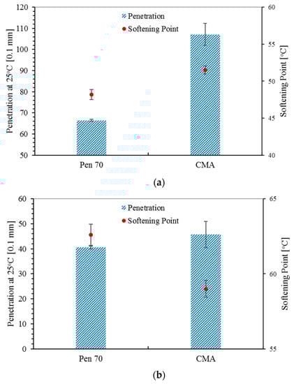 The results of the penetration (25 °C) and softening point tests are presented in Figure 4.