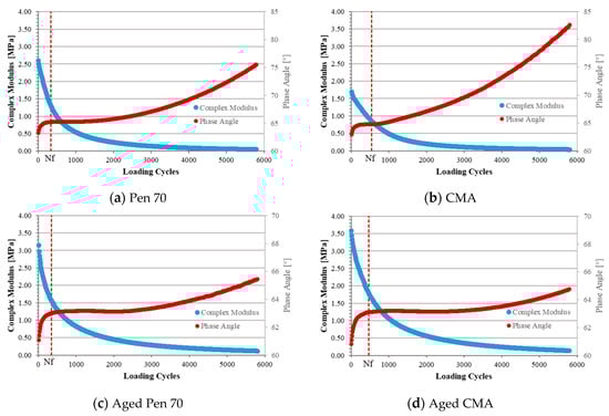 The fatigue property of asphalt binder was characterized using time sweep test []. Time sweep tests were carried out at 20 °C under a control–displacement model. The oscillation displacement was set as 6 rad. Repeated sinusoidal load with a constant loading frequency of 10 rad/s was applied on all types of specimens. During the test, complex modulus and phase angles were monitored as a function of loading cycles. For each specimen, three replicate tests were performed.