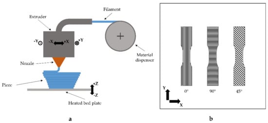 One of the most employed 3D printing techniques, in both consumer and enterprise environments, is the Fused Filament Fabrication (FFF). This process, developed by Stratasys Inc. in the early 1990s with the commercial naming of Fused Deposition Modelling (FDM), has been employed in many fields such as aerospace, medical, construction and cultural [,]. Initially the main applications were the kinematic functionality testing, design verification and fabrication of models for visualisation []. However, at present, FFF also has a significant role in the rapid production of finished parts []. As in other applications of 3D printing technologies [], in this process the part is built as a layer-by-layer deposition of a feedstock filament material. The raw material is partially melted, extruded and deposited onto the previously built model by a numerically controlled heated nozzle [] (Figure 1a). After the deposition, the material cools and sticks with the surrounding material and the machine can move the nozzle upward, along the z-axis, for the deposition of the next layer. Initially, FFF printers have been able to build parts only in acrylonitrile–butadiene–styrene (ABS) and polylactic acid (PLA). The latter one, compared to ABS, has stronger mechanical resistance and lower coefficient of thermal expansion. The last property improves the printability of the material because it reduces the delayering problems and the warp effect during the printing phase. Consequently, the residual stresses in the material should also be reduced [,,]. Nowadays, many others materials have been employed and developed, e.g., metal [], ceramics [], bioresorbable polymer (PCL) [], metal/polymers mixture materials [] and short fibre composites [].