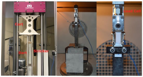 In Figure 3 a schematic representation of the impact test is shown. One end of the specimen is clamped to the test fixture while at the other end a crosshead is fixed. When the striker hits, the crosshead breaks the specimen. The striker, made of steel, is composed by two different sections (Figure 2): the Y-shape dart (41 cm length) and the cart to add the mass of the striker.