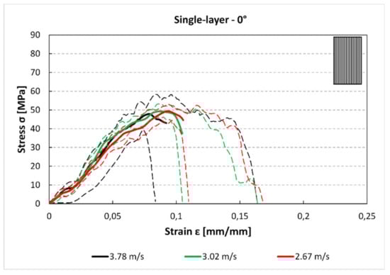 Single-layer stress–strain curve for 0° specimen and for each impact speed.