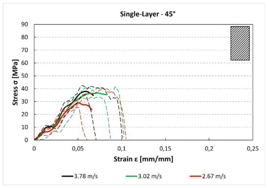 Single-layer stress–strain curve for 45° specimen and for each impact speed.