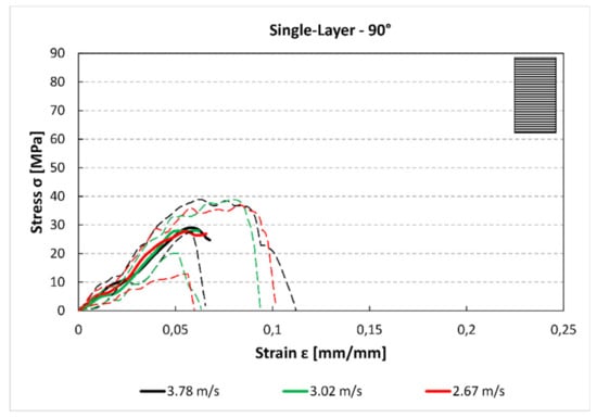 Single-layer stress–strain curve for 90° specimen and for each impact speed.