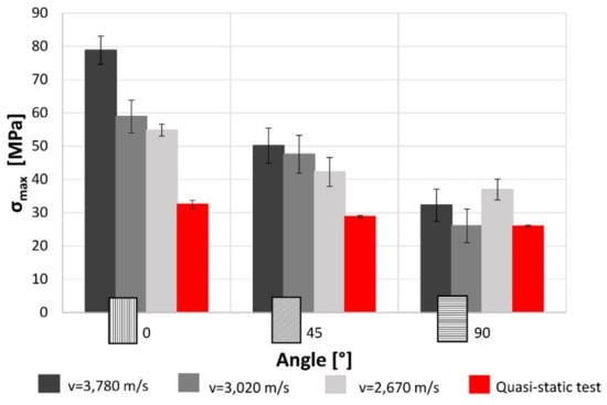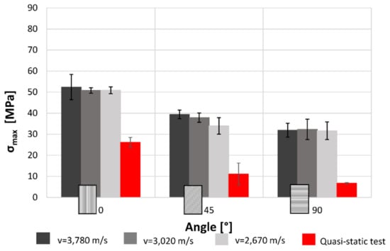 Furthermore, the tests show that increasing the raster angle there is a reduction of the maximum stress (Figure 8). However, the variation among the three speeds can be neglected because the stress values are mostly the same for each speed. In addition, the results from quasi-static tensile test are lower than the dynamic values.