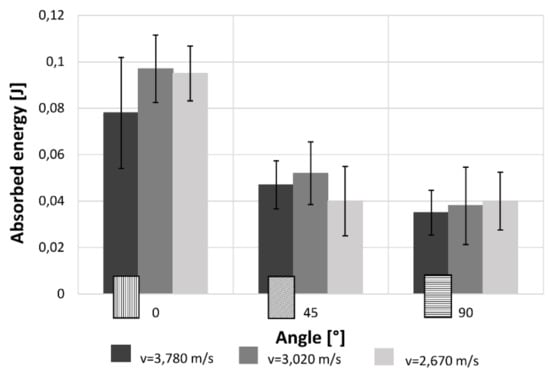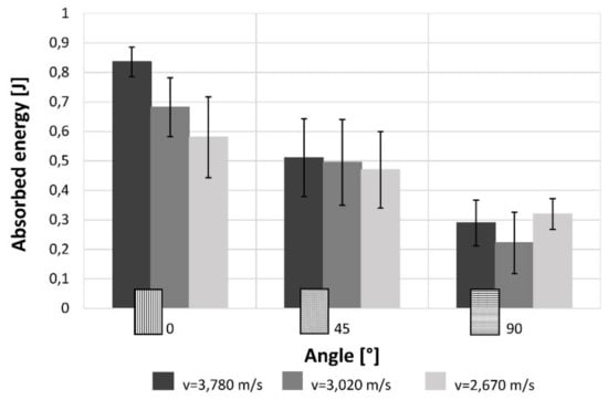 Figure 9 highlights that the trend of the absorbed energy is comparable to the maximum stress trend. Indeed, when increasing the raster angle there is a great reduction of the absorbed energy. Also in this case, the alterations due to the impact speeds considering the uncertainty can be considered not relevant from a statistical point of view. The recorded values are lower in comparisons with that measured under quasi-static condition, except for the 90° raster angle. This could probably be due to the extremely fragile behaviour of the 90° samples even in quasi-static conditions.