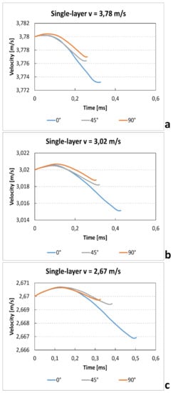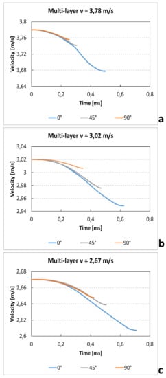 Similarly to the single-layer tests, the values of velocity–time for different raster angles and impact speeds are recorded in Figure 17. Also in this case, the results show a clear increase of time test and a reduction gradient velocity with increase of impact speed. Furthermore, likewise to the single-layer specimen, those printed with 0° raster angle show a higher duration of test. In fact, in this direction, the beads parallel to the load increase the strength of the samples