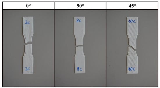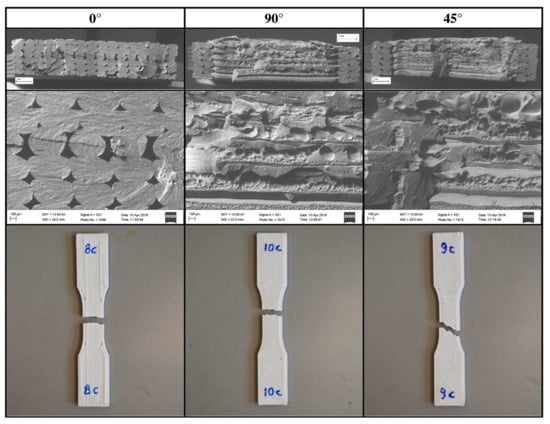 In Figure 11, an example of the fracture of the single-layer specimens is reported. The 0° specimens show tensile failure of individual fibres resulting in the highest maximum stress and absorbed energy among the tested raster angles. The 90° specimens had the lowest maximum stress and absorbed energy mainly because the applied loads weighs on the bonding between fibres. In a similar way for the 45° specimens, the crack propagation moves inside the weak part of the specimens that is in the bonding between two beads.