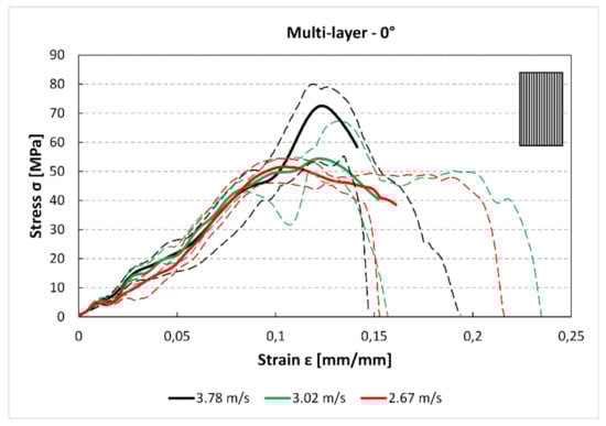 Multilayer stress–strain curves for 0° specimens and for each impact speed.