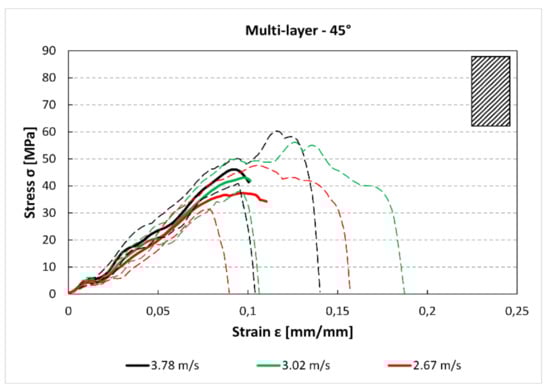 Multilayer stress–strain curves for 45° specimens and for each impact speed.