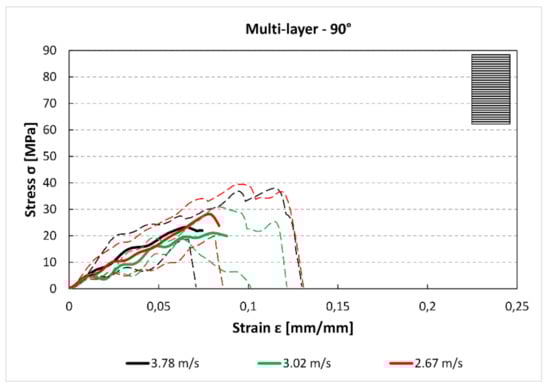 Multilayer stress–strain curves for 90° specimens and for each impact speed.