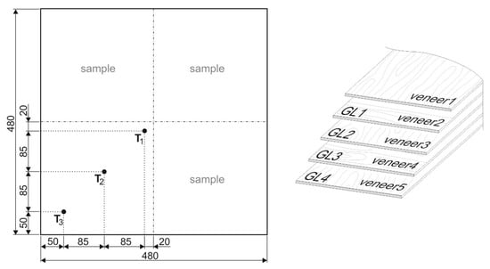 A temperature of 105 °C in the adhesive layer furthest from the surface of the pressed plywood must be achieved for the appropriate curing of the UF adhesive. For this purpose, the time taken to heat to 105 °C was evaluated. The composition of the veneer test groups was adapted as well: The temperature sensors were inserted between the third and the fourth veneer to monitor the temperature during the pressing process. Temperature measurement was carried out using three “K” thermocouples (Figure 1). Data from thermocouples were evaluated using the multimeter GW Instek GDM-8255A (Good Will Instrument Co., New Taipei City, Taiwan).