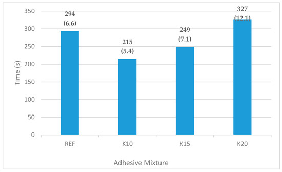 The effect of the adhesive mixture formulation on the time necessary to heat up the test groups during pressing was studied in the experiment. The time necessary to heat up the sample to the required temperature (105 °C) in the centre of the adhesive layer was observed. The average values of the time measured in the case of tested adhesive mixtures REF, K10, K15, K20 are shown in Figure 2.
