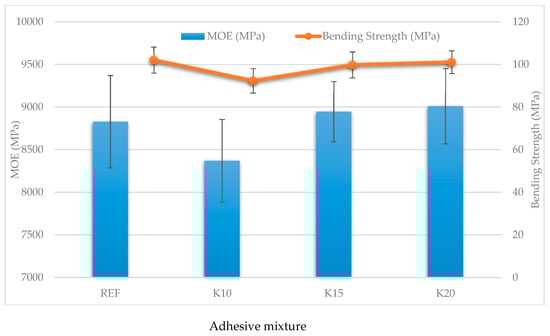 The experimentally made plywood was analyzed using the three points bending test. The quality of the bonded joint was tested using the bending test. Average values and deviations of the experimentally determined mechanical properties are mentioned in Figure 6.