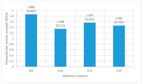 Figure 7 shows the values for the perpendicular tensile strength of all of the tested plywoods with varying adhesive mixtures (REF, K10, K15, K20). All perpendicular tensile strength mean values obtained were above the limit (1 MPa) given in the standard EN 319.
