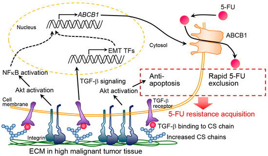Furthermore, Hoshiba et al. prepared dECM derived from cultured cells with different malignant levels known as “staged tumorigenesis-mimicking matrices” [39,75]. We prepared staged tumorigenesis-mimicking matrices through the culture of breast and colorectal cells and found that the resistance of breast and colorectal cancer cells against 5-FU increased in response to dECM that was derived from cells with the highest malignant level (i.e., highly invasive cells). Specifically, 5-FU resistance mechanisms were investigated in colorectal cancer [76,77]. We prepared staged colorectal tumorigenesis-mimicking matrices using the culture of invasive HT-29 cells (highly malignant dECM), noninvasive SW480 cells (low malignant dECM), and normal CCD-841-CoN cells (normal dECM). HT-29 cells were also cultured on staged tumorigenesis-mimicking matrices. On highly malignant dECM, HT-29 cells expressed the drug-efflux transporter ABCB1 at the highest levels among the staged tumorigenesis-mimicking matrices [76]. When HT-29 cells were exposed to 5-FU, the cells underwent EMT and increased ABCB1 expression via the TGF-β signaling pathway. Highly malignant dECM possessed abundant chondroitin sulfate chains, which can interact with TGF-β and efficiently presented it to cells. Thus, highly malignant dECM increased the ABCB1 expression via intracellular signal activation by TGF-β, which was efficiently presented to cells via the binding to chondroitin sulfate [77]. Further, Akt activation partially contributed to the 5-FU resistance in HT-29 cells [76] (Figure 1).