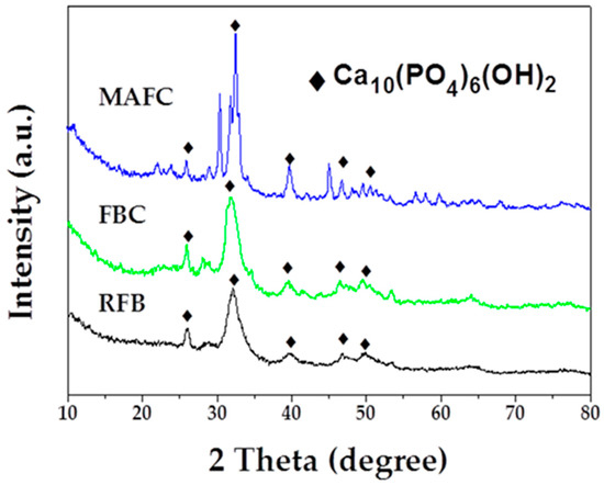 The crystalline structure and the purity of as-prepared samples were assessed using X-ray diffraction (XRD). RFB showed a crystalline structure with peaks at angles (2θ) of 25.9°, 32.2°, 39.8°, and 46.7°, which could be indexed as (002), (112), (310), and (222) (PDF# 09-0432). After carbonization, the data of FBC charcoal also displayed a consistent crystalline structure, with peaks of the fishbone charcoal located at angles (2θ) of 25.9°, 31.8°, 32.2°, 39.8°, and 46.7°, which could be perfectly indexed as (002), (211), (112), (310) and (222). There may have been a small amount of graphite, however, it may have been in the amorphous phase, as observed at approximately 30° for the sample FBC. After further activation, we observed that MAFC peaks located at 25.9°, 31.8°, 32.2°, 39.8°, and 46.7° could be indexed as (002), (211), (112), (310), and (222) (PDF# 09-0432). XRD analysis of hydroxyapatite [40] presents peaks at angles 2θ = 25.9°, 31.9°, 39.8°, and 46.4°. These data indicate that the main component in fishbone and fishbone charcoal was hydroxyapatite. As shown in Figure 3, the intensity of the diffraction peaks at around 2θ = 32.2° increased significantly after K2CO3 activation [23,41], suggesting that a well-developed calcium hydroxyphosphate skeleton structure had been fully constructed in MAFC. This may be confer MAFC excellent adsorption performance and the ability to restrain emulsified oil molecules.