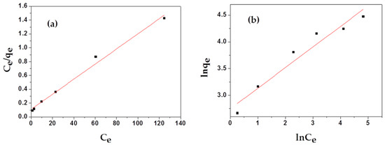 - Freundlich modelwhere Ce (mg/L) is the equilibrium concentration in the solution, qe (mg/g) is the emulsified oil adsorbed at equilibrium, b (mg/g) is the maximum adsorption capacity, n is the Freundlich constant related to adsorption intensity, and qmax (mg/g) and Kf ((mg/g) (L/mg)1/n) are the adsorption constants for Langmuir and Freundlich models, respectively.