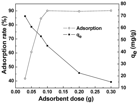 The effect of the adsorbent dose on the adsorption of MAFC to emulsified oil is seen in Figure 8. The adsorption capacity gradually decreased with the increase of adsorbent dosage, while the adsorption rate gradually increased and then tended to be stable. This is because more surface active functional groups were available with a greater dose of adsorbent, which could result in a higher adsorption rate. However, the adsorption efficiency was limited by the constant initial emulsified oil concentration. As shown in Figure 8, the adsorption rate of around 90.1% tended to be stable with 0.1 g adsorbent added in 100 mg/L oily wastewater, and the adsorption capacity reduced to 45.05 mg/g. Therefore, we could choose 0.1 g as an optimum dose for MAFC.