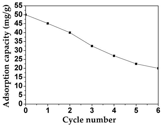 For the practical application of MAFC, its recycling performance and its efficiency were estimated. As shown in Figure 10, the adsorption capacity of MAFC to emulsified oil was measured for six testing cycles (each cycle for 60 min). In the first cycle, 45.15 mg/g of emulsified oil was adsorbed, and after all cycles, this adsorption capacity of MAFC still reached 20 mg/g, indicating that MAFC has the stability and efficiency to be used as a good adsorbent.