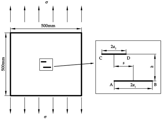 A finite element model of a plate with two through-thickness parallel cracks under uniform remote tension σ of 125 MPa is established, as shown in Figure 1. The plate model is 500 mm × 500 mm × 6 mm in size. The length of the long crack and the short crack is 2a1 and 2a2, respectively. The ratio of the short crack length to the long crack length, a2/a1, is denoted by Ra, and the long crack length a1 is 3 mm. Since the crack size is significantly smaller than the plate size, the plate can be considered as an infinite plate. Particularly, as shown in Figure 1, the crack tips of the long crack and the short crack are represented with symbols A, B, C, and D. The deviation and normal distances between the two cracks are denoted by s and h, respectively. Specially, if the deviation distance s equals zero, two cracks share the same perpendicular bisector. If the normal distance h equals zero, two cracks are considered to be collinear. The material adopted in this model is 304 stainless steel with the Young’s modulus of 195 GPa and the Poisson’s ratio of 0.3 [30]. Linear–elastic analysis is performed to calculate the stress intensity factors at the crack tips.