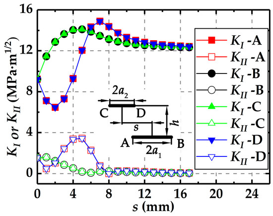 As shown in Figure 1, the plate model is subjected to the uniform tensile loading. Figure 3 illustrates the changes of stress intensity factors at the four crack tips with the increasing s at h = 2.5 mm for Ra = 1.0. Although both the two cracks are mixed mode I and II, it can be seen from Figure 3 that the mode II stress intensity factor, KII, is much smaller than the mode I stress intensity factor, KI, for a given s and h. Therefore, only KI is considered to evaluate the interactions between the parallel cracks. In addition to the crack sizes, the crack relative distances, i.e., the deviation s and normal distance h, should be considered to affect the crack interactions.