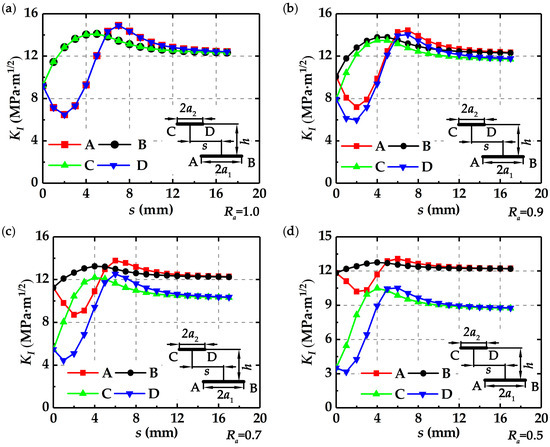 Figure 4 shows that the stress intensity factors at the four crack tips change with crack length ratio Ra and deviation distance s at h = 2.5 mm.