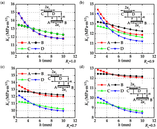 Figure 5a–d show the changes of KI with the increasing h at s = 7 mm for Ra = 1.0, Ra = 0.9, Ra = 0.7, and Ra = 0.5, respectively. It seems that KI at tips A and D decreases almost linearly with the increasing h, while KI at tips B and C decreases in a parabola manner with the increasing h, implying that h affects the near crack tips and remote crack tips to different degrees. In addition, KI decreases with the decreasing Ra for the same h, which means that the relative crack sizes influence their interactions. It is also found that the value of KI at the short crack tip is less than that at the long crack tip, and the difference of KI between two cracks increases with the decreasing Ra.