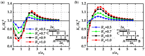 Figure 6 shows the values of KI/KI0 at tips A and B changing with s/a1 at h = 2.5 mm for different Ra. It is observed that if the value of s/a1 is small, the corresponding value of KI/KI0 is less than one, which means that the influence of the short crack on the long crack is shielding. As s/a1 increases, the value of KI/KI0 increases to be larger than one, meaning that the shielding effect of short crack turns into the enhancement effect. When the value of s/a1 is more than five, the value of KI/KI0 approaches one, indicating that the interactions between two cracks vanish. These results illustrate that the deviation distance between two parallel cracks plays a key role in the crack interactions. As shown in Figure 6, it is observed that the crack length ratio, Ra, also affects the crack interactions. Actually, a larger Ra tends to pose a greater enhancement or shielding effect.