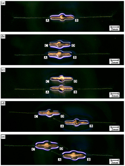 For the SC specimen, as shown in Figure 10a, the paths are perpendicular to the loading direction. For the PC0.9S0 and PC1.0S0 specimens, the crack paths of the tips A and B are perpendicular to the loading direction but the cracks do not grow at the tips C and D due to the shielding effect caused by the adjacent crack, as shown in Figure 10b,c. For the PC0.9S7 and PC1.0S7 specimens, the crack growth paths of the tips B and C are perpendicular to the loading direction, but the cracks growth paths of the tips A and D are no longer perpendicular to the direction of the loading, clearly also because of crack interactions, as shown in Figure 10d,e.
