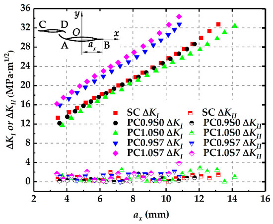 Figure 11 shows ΔKI and ΔKII at the crack tip B changing with the horizontal growth length ax in different specimens. Clearly, ΔKI increases almost linearly with the increasing ax for all the specimens. ΔKII, however, fluctuates around a very small value, which means that the cracks propagate in Mode I. Compared with ΔKI in the single crack, ΔKI at tip B in the two parallel cracks with the deviation distance (PC0.9S7 and PC1.0S7) increases significantly while that in the two parallel cracks without the deviation distance (PC0.9S0 and PC1.0S0) decreases in some extent. Obviously, these results are consistent with those obtained in Section 2.3.1.