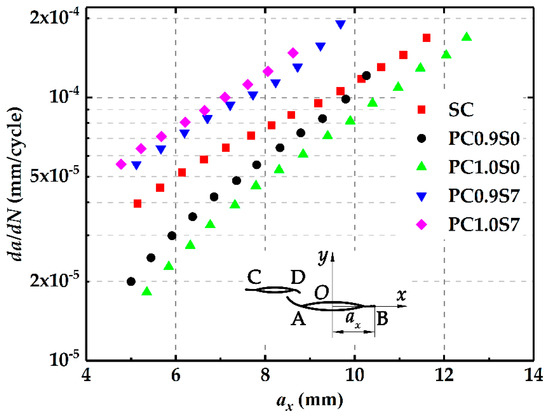 Figure 12 shows crack growth rates at the crack tip B changing with the horizontal growth length ax in different specimens. It is found that at the same ax, the crack growth rates in the PC0.9S7 and PC1.0S7 specimens are higher than those in the SC specimen. In contrasts, the growth rates in PC0.9S0 and PC1.0S0 specimens are lower than those in the SC specimen. For the specimens with the same deviation distance, the crack growth rates in the PC1.0S7 specimen are larger than those in the PC0.9S7 specimen, while the crack growth rates in the PC1.0S0 specimen are smaller than those in the PC0.9S0 specimen. Combined with the simulation results in Section 2.3, it can be found that crack growth rates are influenced by the enhancement or shielding effect. Specifically, the crack growth rates in the parallel crack specimen increase with the increasing enhancement effect while decrease with the increasing shielding effect.