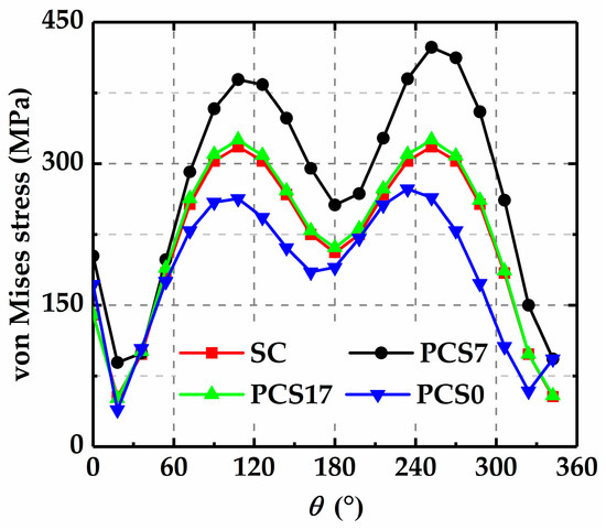 To prove this viewpoint, the changes of the stress fields around the cracks caused by crack interactions are obtained. Figure 13 shows the stress distributions in the vicinity of the crack tips for the single crack (SC), the two equal parallel cracks with s = 7 and h = 2.5 (PCS7), s = 17 and h = 2.5 (PCS17), and s = 0 and h = 2.5 (PCS0). In order to avoid the stress singularity at the crack tip, a circle with the center at tip A and the radius, r, of a1/10 is chosen, as shown in Figure 14, to compare the stress distributions in the vicinity of tip A for different crack configurations.