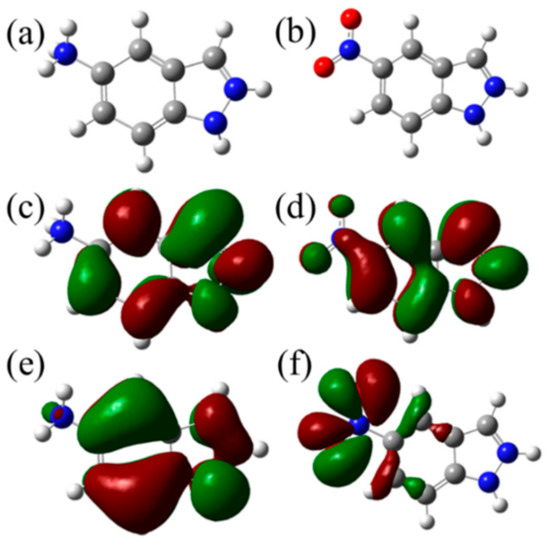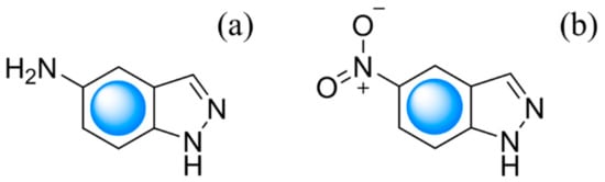 Molecular structures of indazole derivatives, (a) 5-aminoindazole; (b) 5-nitroindazole.