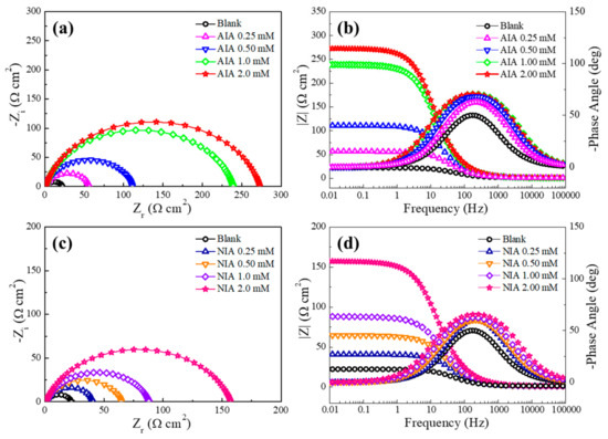 Figure 2 shows the electrochemical impedance spectra plots of AIA and NIA, respectively. In Figure 2a,c, it can be seen that the radius of the capacitive resistance arc increased with the growing concentration of inhibitors, which indicates that the protective layer was formed on the steel surface by the adsorption of AIA or NIA and that the corrosion inhibition efficiency of AIA is better than NIA. In addition, the impedance spectrum exhibits a squashed semicircle, which is caused by the formation of a protective layer on the steel surface. Figure 2b,d is Bode plots in the presence and absence of AIA and NIA, respectively. The impedance values and phase angle values increase with the growing concentration of inhibitors. In addition, a time constant can be found in the phase angle, usually due to the relaxation effect of the corrosion inhibitor molecule adsorption [2,13].